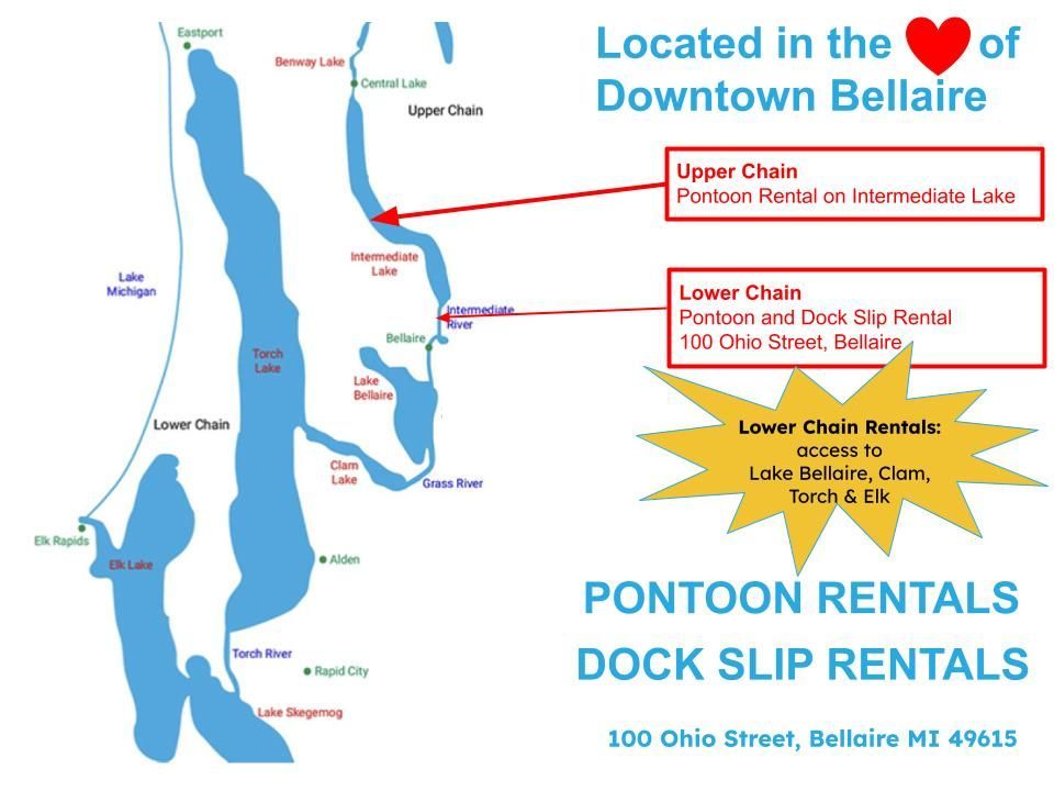 Welcome to M-88 Boat & Dock Rentals, your premier destination for renting pontoon boats and dock slips in downtown Bellaire, Michigan. We offer flexible rental options for both boats and docks, allowing you to enjoy the beautiful Antrim county Chain of lakes. This includes Lake Bellaire, Clam Lake, Torch Lake, and Elk Lake on a weekly, daily, or seasonal basis.